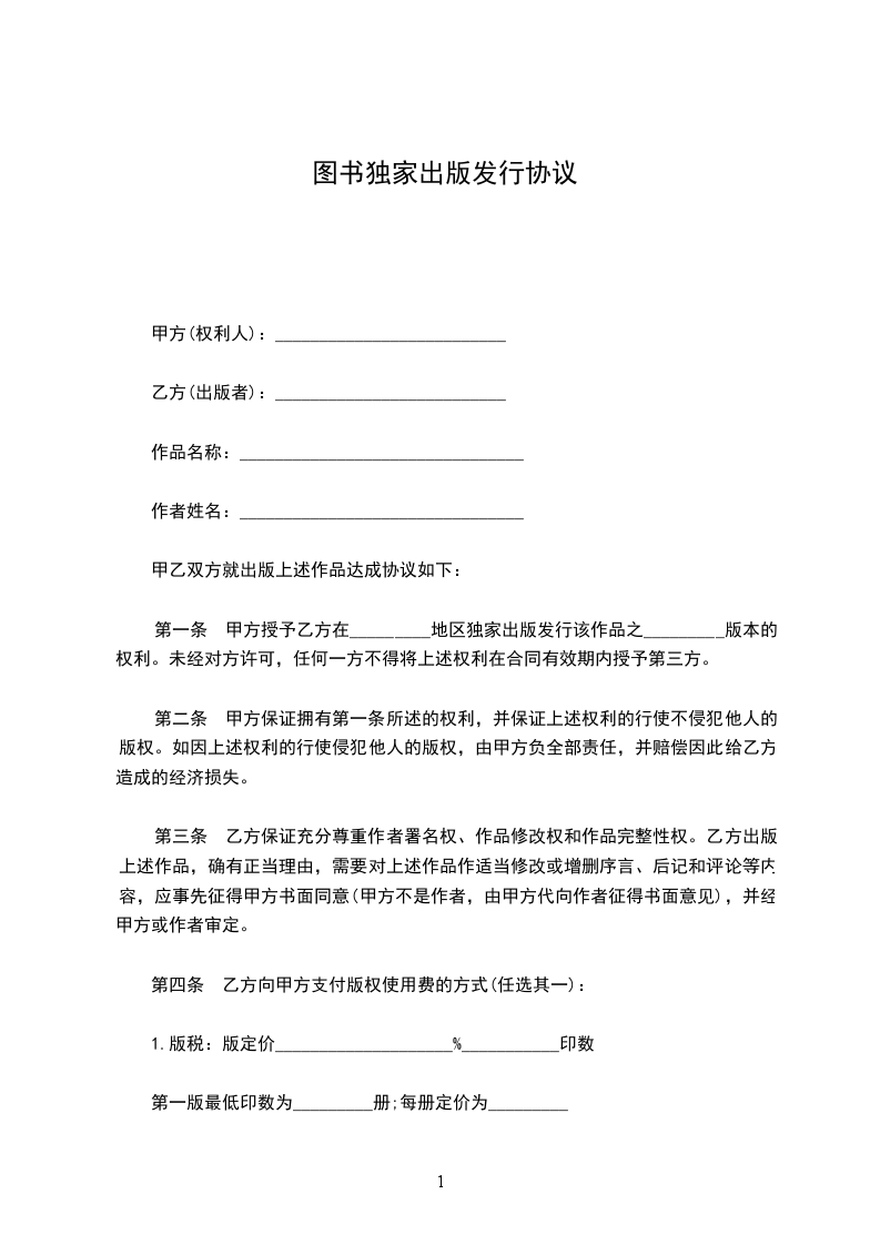 第一条 甲方授予乙方在_________地区独家出版发行该作品之_________版本的权利。未经对方许可,任何一方不得将上述权利在合同有效期内授予第三方。