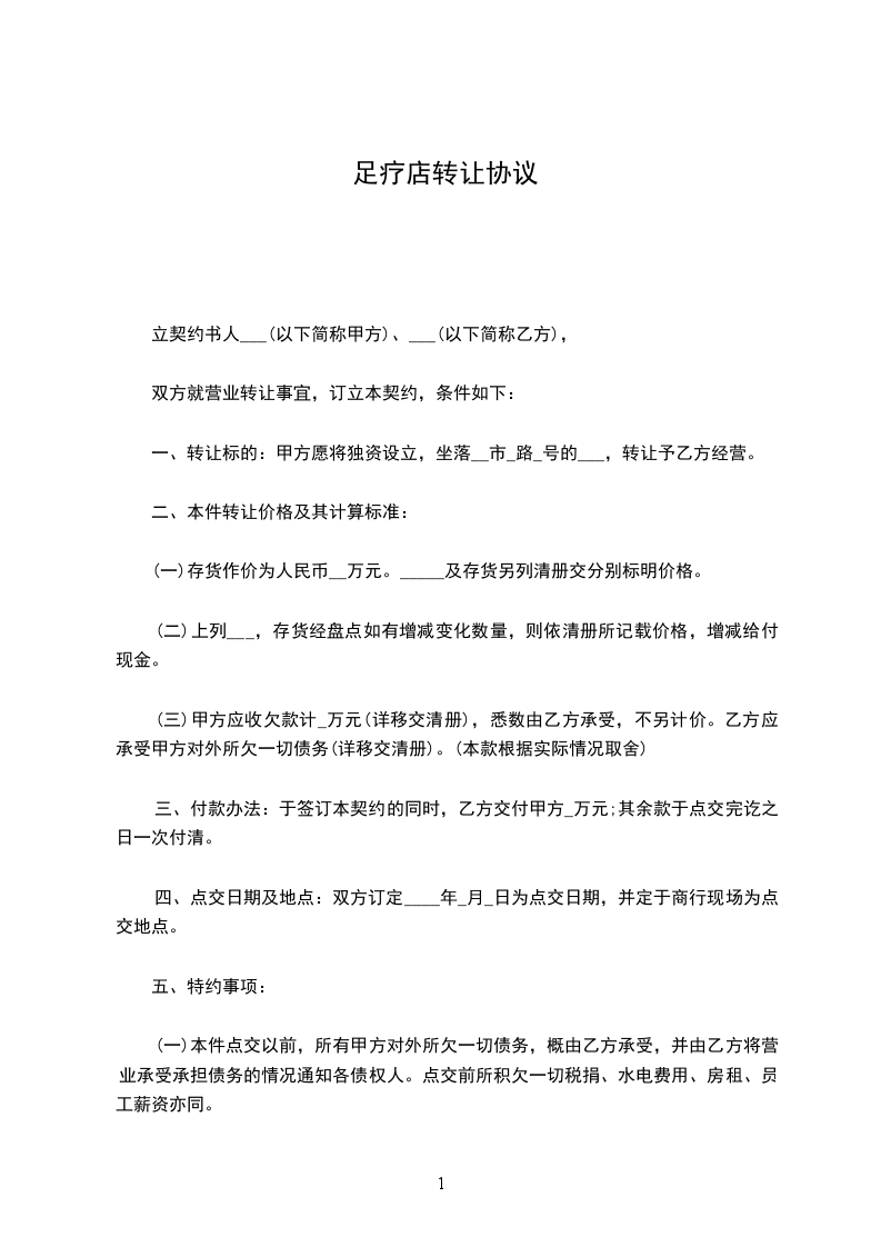 经甲乙双方友好协商,甲方将其所经营的位于________的________足浴店转让给乙方,现就转让事宜达成如下协议: