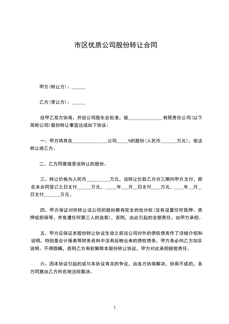 一、甲方将其在_______________公司_____%的股份(人民币_______万元),依法转让给乙方。