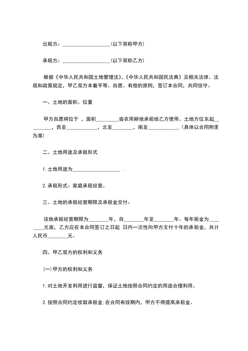 该地承租经营期限为________年,自________年________月________日至________年________月________日。每年租金为________元/亩,乙方应在本合同签订之日起________日内一次性向甲方支付十年的承租金,共计人民币______元。