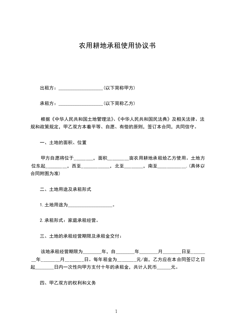 甲方自愿将位于________,面积_________亩农用耕地承租给乙方使用。土地方位东起_________,西至____________,北至________,南至____________.(具体以合同附图为准)
