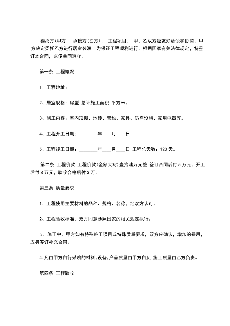 委托方(甲方: 承接方(乙方): 工程项目: 甲、乙双方经友好洽谈和协商,甲方决定委托乙方进行居室装潢。为保证工程顺利进行,根据国家有关法律规定,特签订本合同,以便共同遵守。
