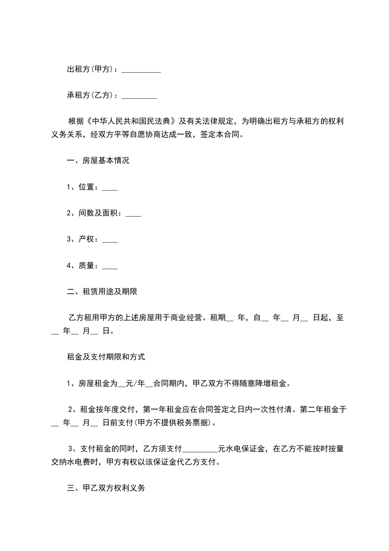 乙方租用甲方的上述房屋用于商业经营。租期__ 年,自__ 年__ 月__ 日起,至__ 年__ 月__ 日。