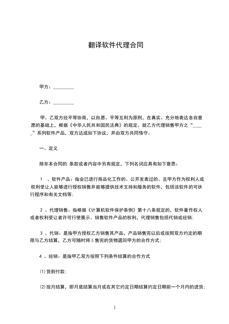 甲、乙双方经平等协商,以自愿、平等互利为原则,在真实、充分地表达各自意愿的基础上,根据《中华人民共和国民法典》的规定,就乙方代理销售甲方之“_____”系列软件产品,双方达成如下协议,并由双方共同恪守。