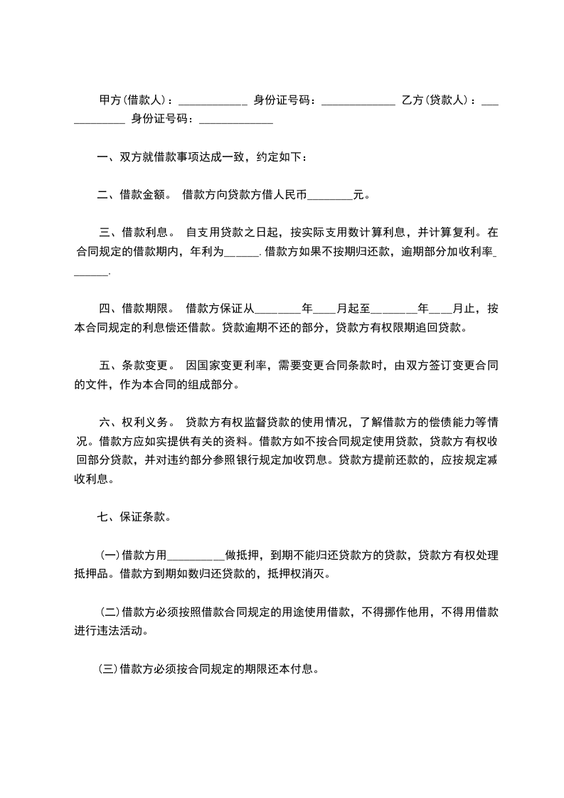 甲方(借款人):____________ 身份证号码:_____________ 乙方(贷款人):____________ 身份证号码:_____________