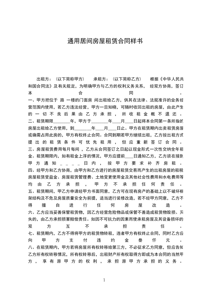 一、甲方把位于 路 一楼的门面房 间出租给乙方,供其在法律、法规准许的业务经营范围内使用,若乙方违法经营,甲方一旦知晓,可随时收回出租的房屋,由此产生的一切不良后果由乙方承担,所收租金概不退还。
