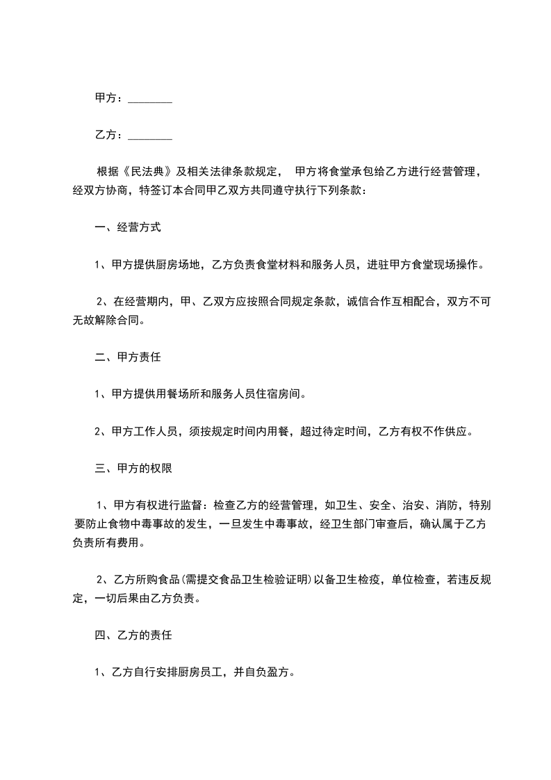 根据双方条件的需要,甲、乙双方经平等协商,甲方食堂与乙方经营者的最终决定,作出明确双方的权利与责任,共同制定以下合同条约: