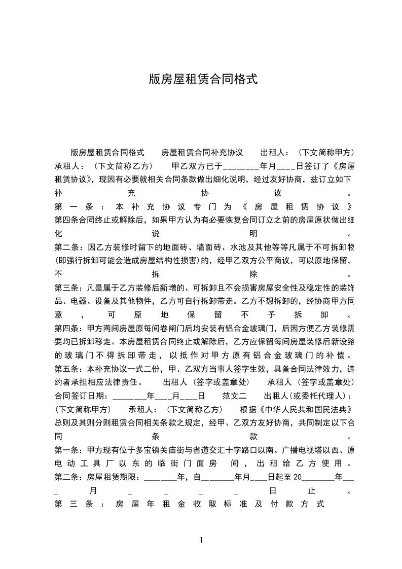 版房屋租赁合同格式 房屋租赁合同补充协议 出租人: (下文简称甲方) 承租人: (下文简称乙方) 甲乙双方已于________年月____日签订了《房屋租赁协议》,现因有必要就相关合同条款做出细化说明,经过友好协商,兹订立如下补充协议。