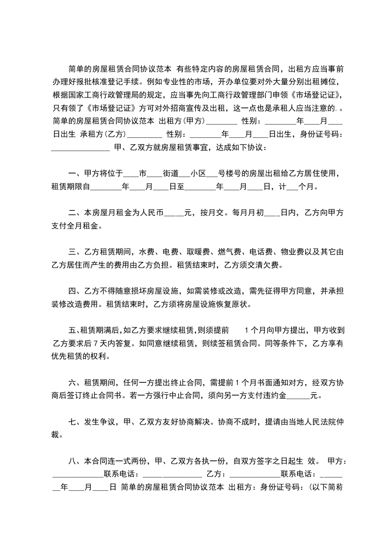 简单的房屋租赁合同协议范本 有些特定内容的房屋租赁合同,出租方应当事前办理好报批核准登记手续。例如专业性的市场,开办单位要对外大量分别出租摊位,根据国家工商行政管理局的规定,应当事先向工商行政管理部门申领《市场登记证》,只有领了《市场登记证》方可对外招商宣传及出租,这一点也是承租人应当注意的.。 简单的房屋租赁合同协议范本 出租方(甲方)________ 性别:________年____月____日出生 承租方(乙方)_________ 性别:________年____月____日出生,身份证号码:_______________ 甲、乙双方就房屋租赁事宜,达成如下协议: