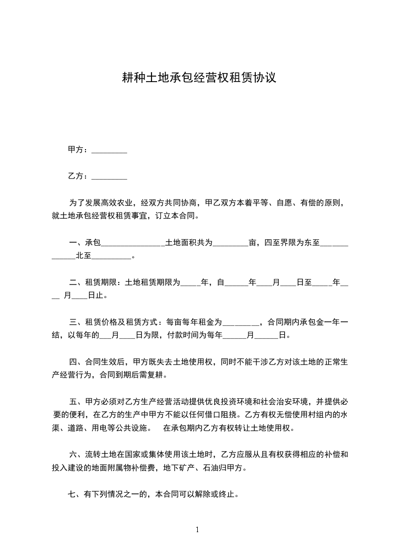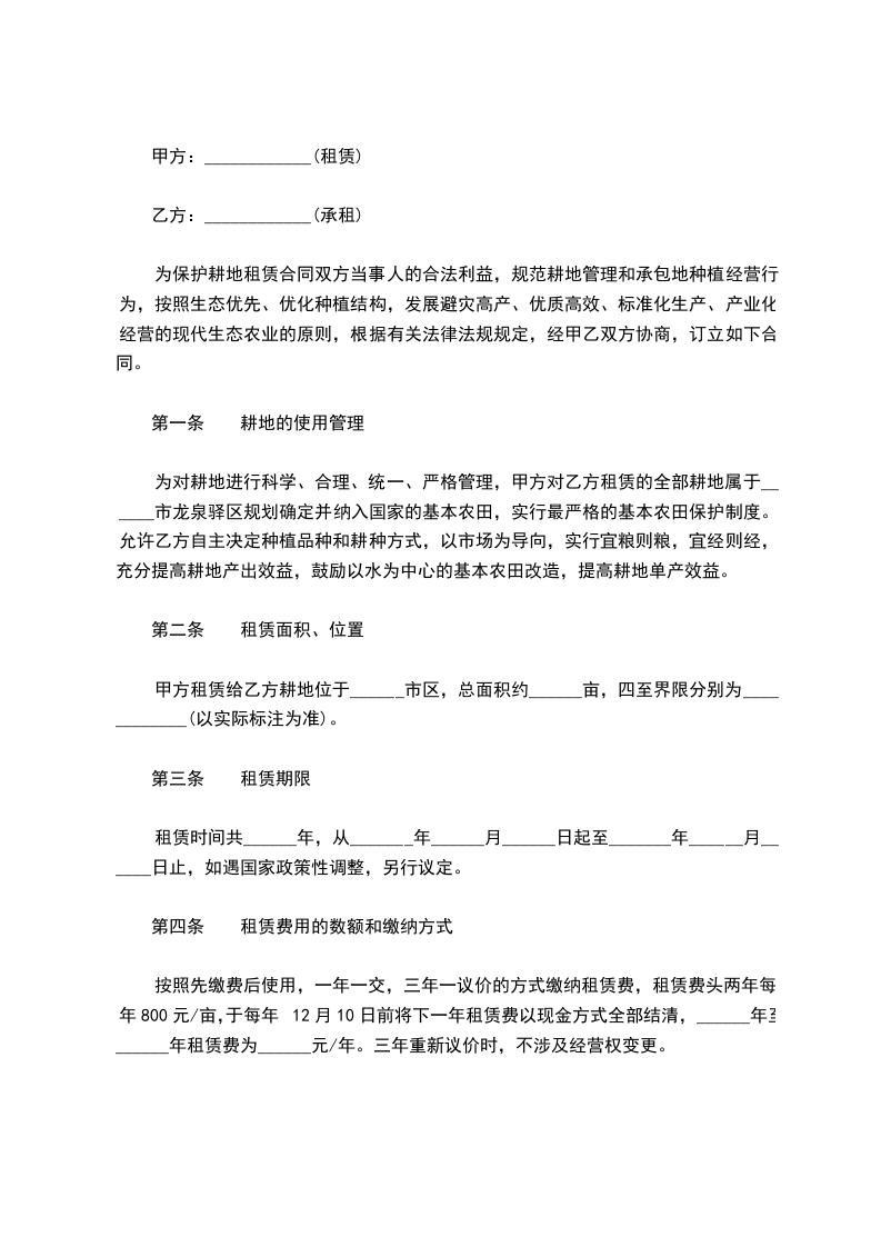 为保护耕地租赁合同双方当事人的合法利益,规范耕地管理和承包地种植经营行为,按照生态优先、优化种植结构,发展避灾高产、优质高效、标准化生产、产业化经营的现代生态农业的原则,根据有关法律法规规定,经甲乙双方协商,订立如下合同。