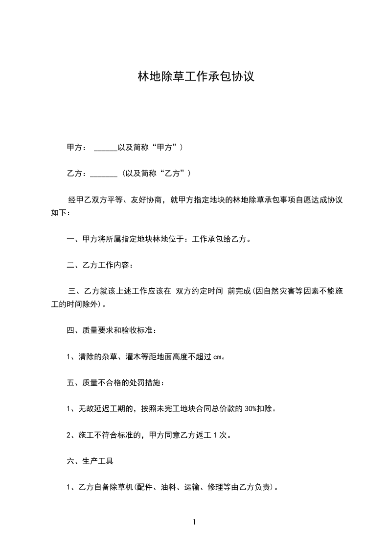 经甲乙双方平等、友好协商,就甲方指定地块的林地除草承包事项自愿达成协议如下: