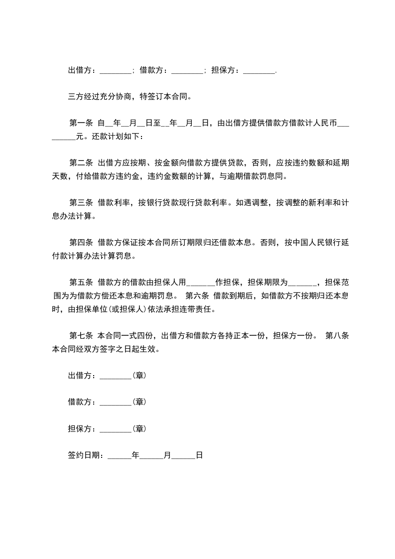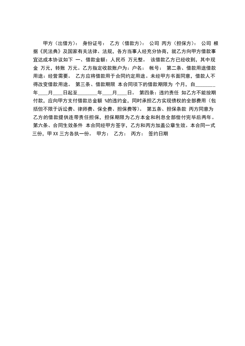 甲方(出借方): 身份证号: 乙方(借款方): 公司 丙方(担保方): 公司 根据《民法典》及国家有关法律、法规,各方当事人经充分协商,就乙方向甲方借款事宜达成本协议如下 一、借款金额:人民币 万元整。 该借款乙方已经收到,其中现金 万元,转账 万元。乙方指定收款账户为:户名: 帐号: 第二条、借款用途借款用途:经营需要。 乙方应将借款用于合同约定用途。未经甲方书面同意,借款人不得改变借款用途。 第三条、借款期限 本合同项下的借款期限为 个月,自________年____月____日起至________年____月____日。 第四条:违约责任 如乙方不能按期付款,应向甲方支付借款总金额 %的违约金,同时承担乙方实现债权的全部费用(包括但不限于诉讼费、律师费、保全费、担保费等)。 第五条、担保条款 丙方同意为乙方的借款提供连带责任担保,担保期限为乙方本金和利息全部偿付完毕后两年。 第六条、合同生效条件 本合同经甲方签字,乙方和丙方加盖公章生效。本合同一式三份,甲XX三方各执一份。 甲方: 乙方: 丙方: 签约日期