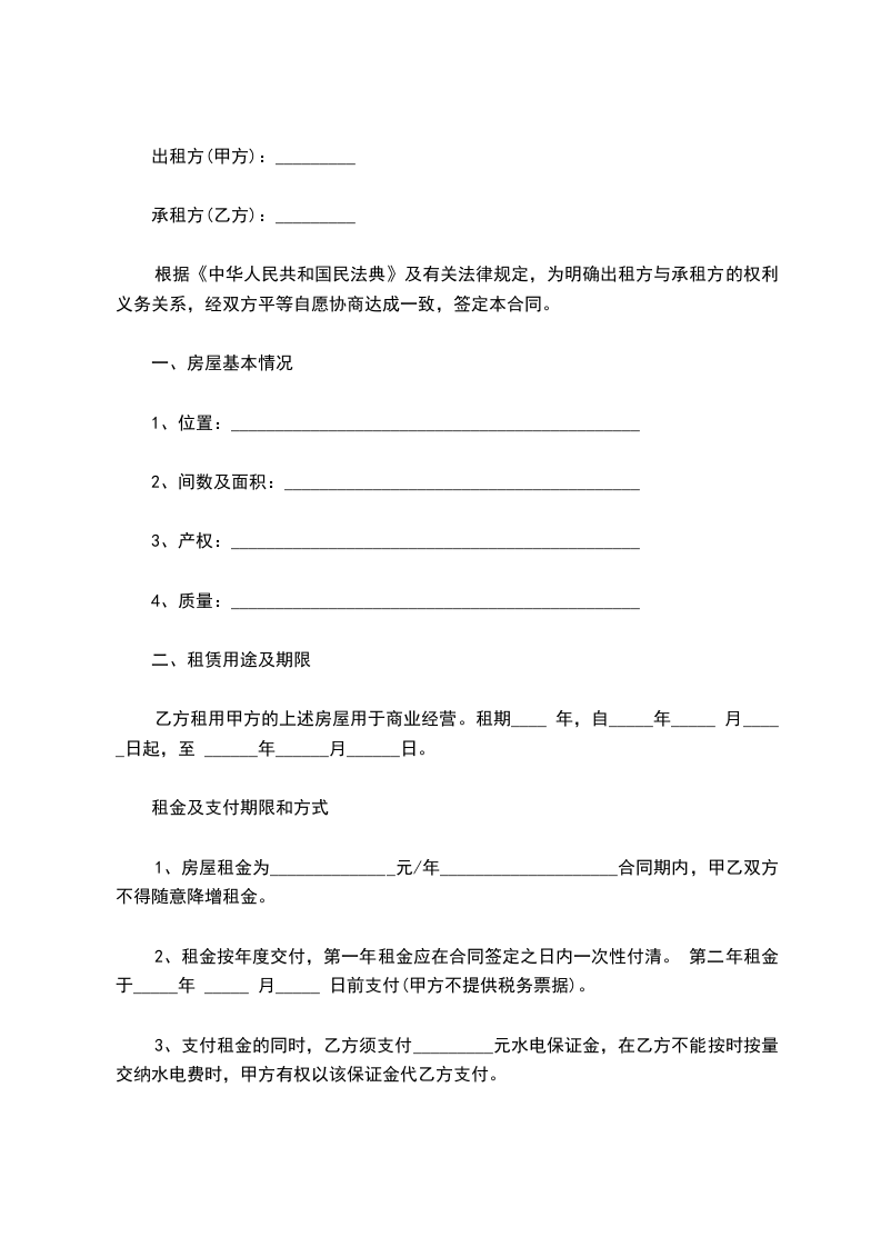 前三年租赁收入,乙方须按人民币_____元 /平方米,共计元一次性返还给甲方(可在甲方交购房首期款内抵扣),从_____年_____月_____日 至_____年_____月_____日 终止;三年后,乙方可以按照商城整体的招商政策、价格对外招商;在该商铺没有出租出去期间,乙方无须支付甲方租金。