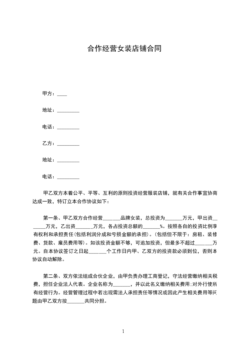 第一条、甲乙双方合作经营_______品牌女装,总投资为_______万元,甲出资_______万元,乙出资_______万元,各占投资总额的_______%。按照各自的投资比例享有权利和承担责任(包括利润分成和亏损金额的承担)。(包括但不限于:房租、装修费、货款、雇员费用等)。如该投资金额不够,可追加投资,但最多不超过_______万元。自本协议签订之日起_______个工作日内甲、乙双方的投资款必须到位,否则本协议自动解除。