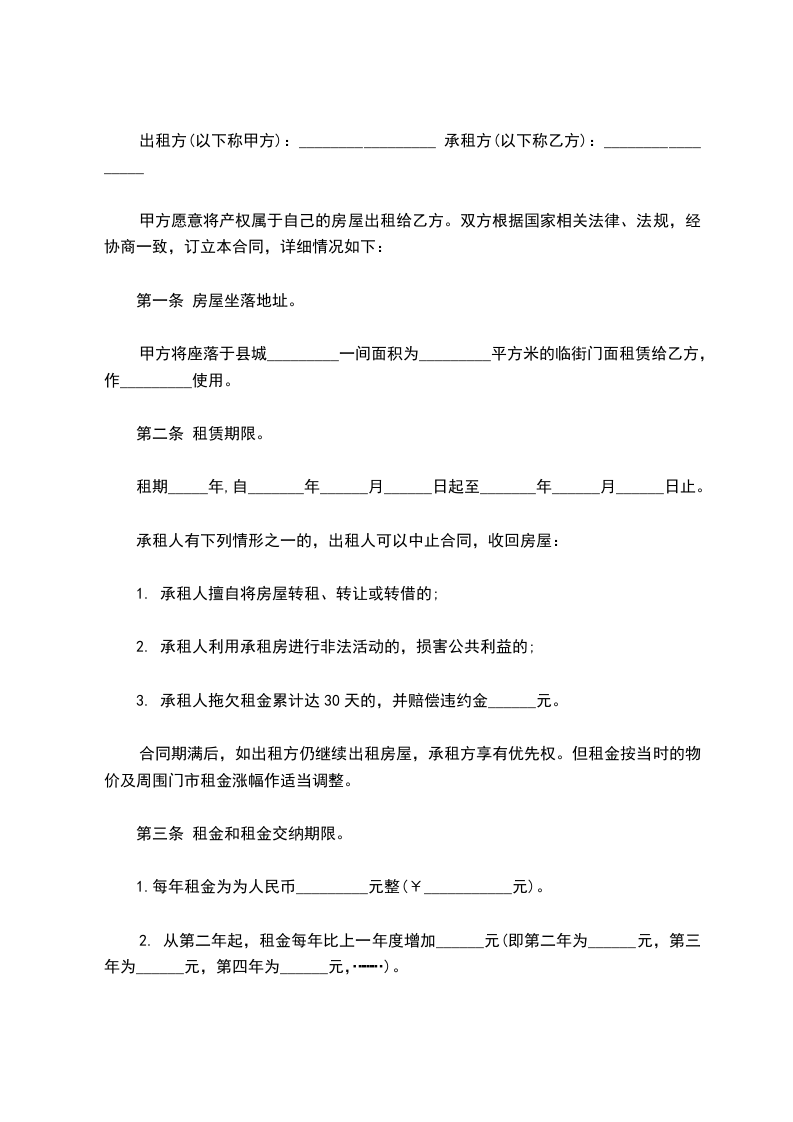 租金:甲乙双方议定月租金为_____元 整,租金每年度支付一次。在合同签订之日交清________年________月________日起至 ________年________月________日止的租金 元整,大写人民币 万 仟 佰 拾 元整,先付后用。第二年度的租金在第一年度的第十二个月内一次性交清,依此类推。第二年起,租金每年一订,随行就市。但乙方必须提早一个月与甲方协商确定,否则合同自动终止。