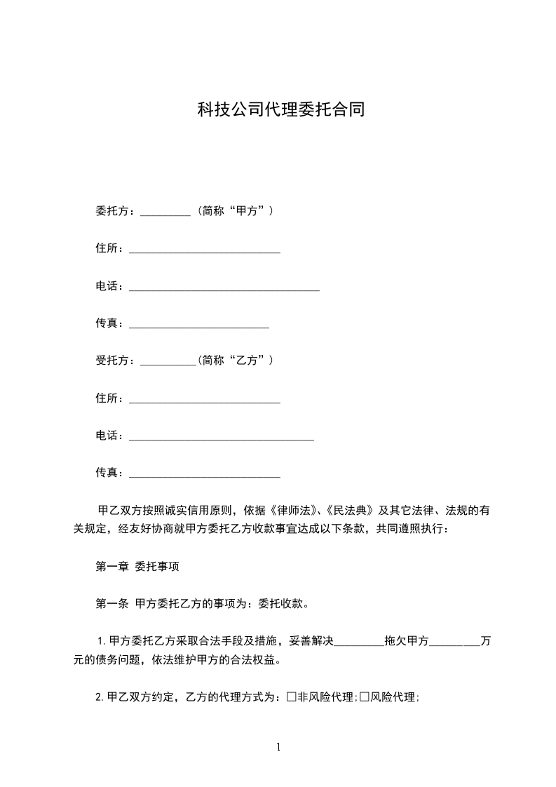 1.非风险代理:甲方应于合同签订日向乙方支付前期费用_________元,代理佣金按债权金额的_________%支付。