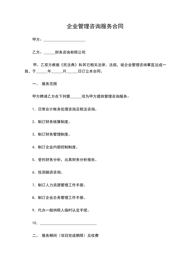 甲、乙双方根据《民法典》和其它相关法律、法规,就企业管理咨询事宜达成一致,于______年______月______日订立本合同。