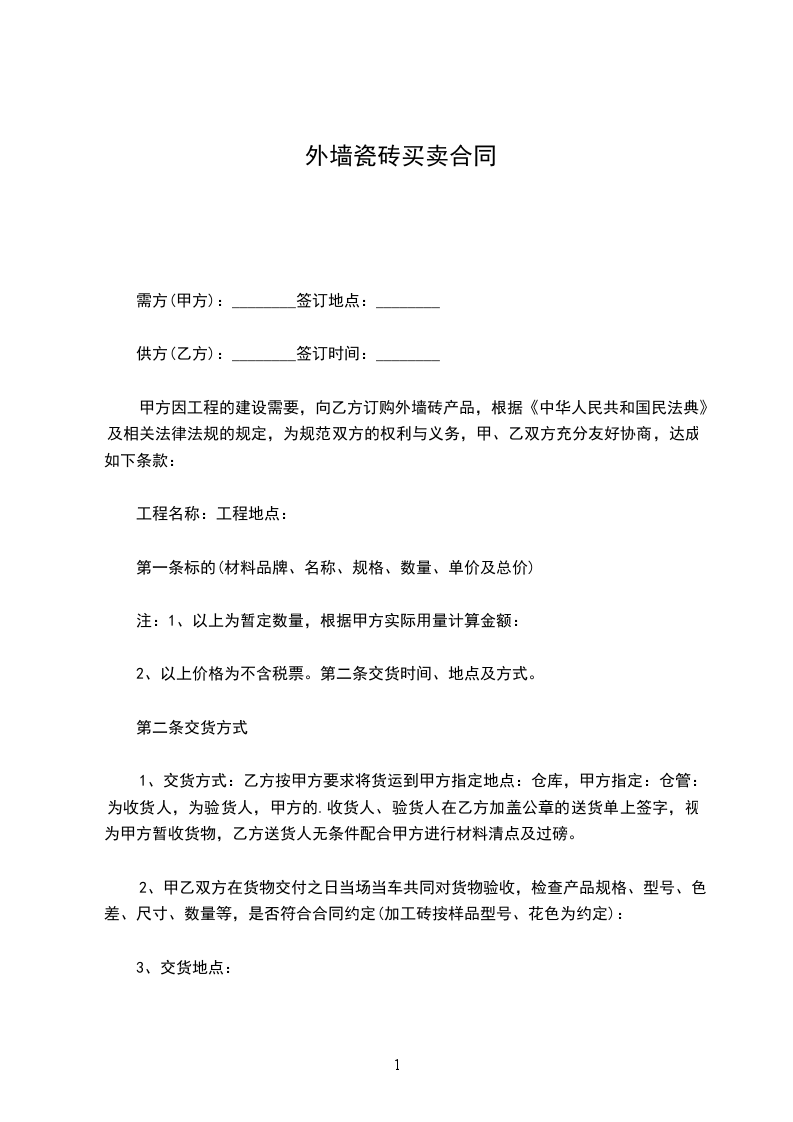 甲方因工程的建设需要,向乙方订购外墙砖产品,根据《中华人民共和国民法典》及相关法律法规的规定,为规范双方的权利与义务,甲、乙双方充分友好协商,达成如下条款: