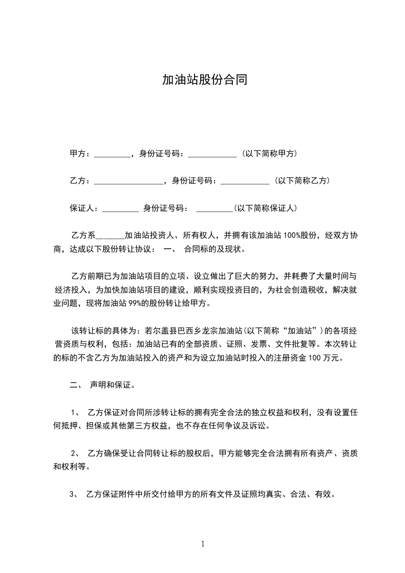 乙方系_______加油站投资人、所有权人,并拥有该加油站100%股份,经双方协商,达成以下股份转让协议: 一、 合同标的及现状。