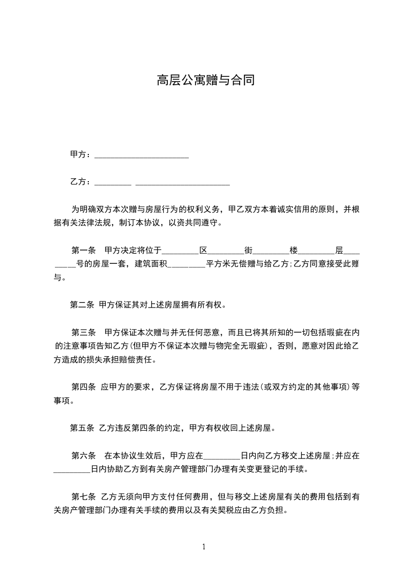 第一条 甲方决定将位于_________区_________街_________楼_________层_________号的房屋一套,建筑面积_________平方米无偿赠与给乙方;乙方同意接受此赠与。