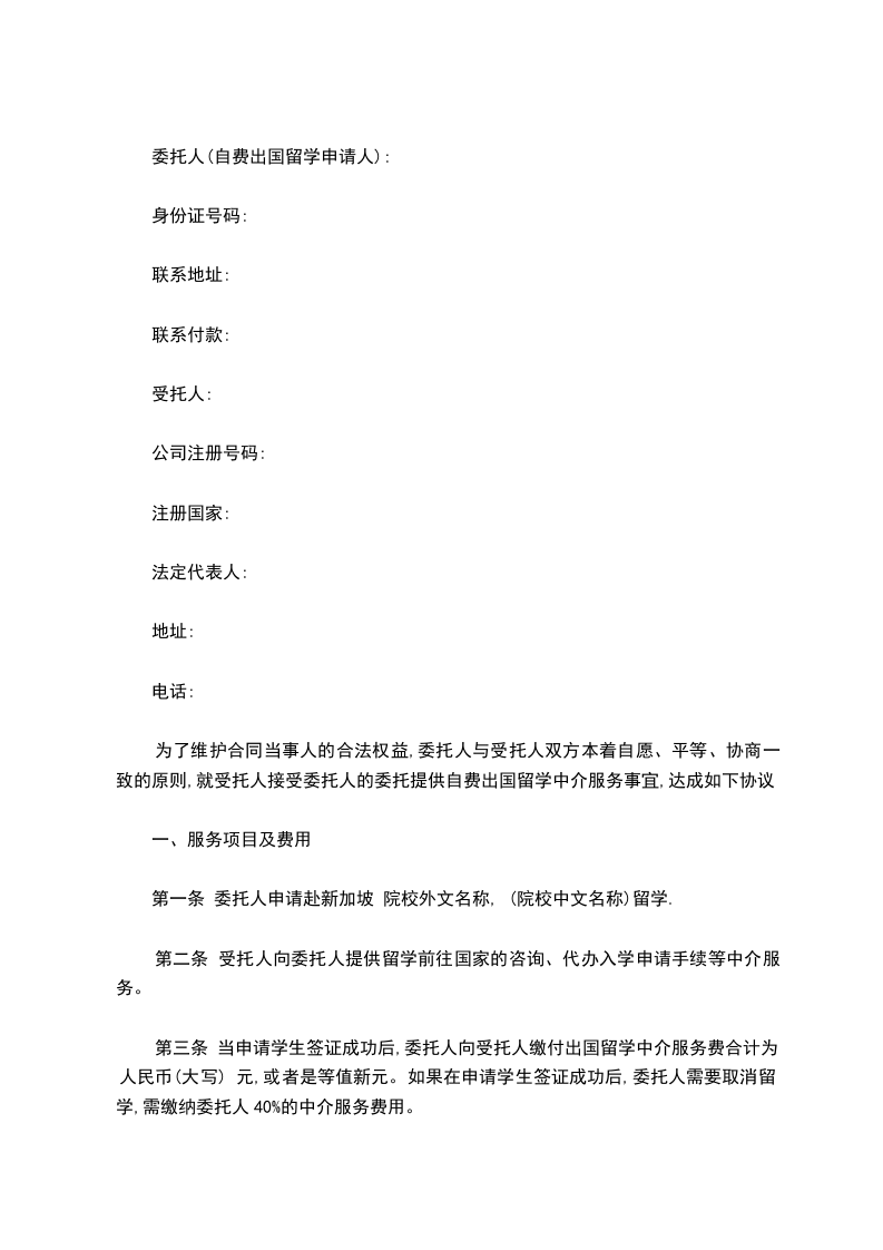 第三条 当申请学生签证成功后,委托人向受托人缴付出国留学中介服务费合计为人民币(大写) 元,或者是等值新元。如果在申请学生签证成功后,委托人需要取消留学,需缴纳委托人40%的中介服务费用。