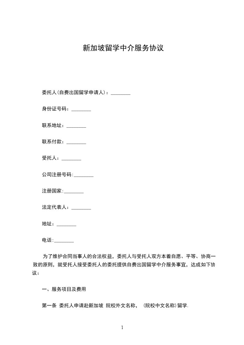 第一条 委托人申请赴新加坡 院校外文名称, (院校中文名称)留学.