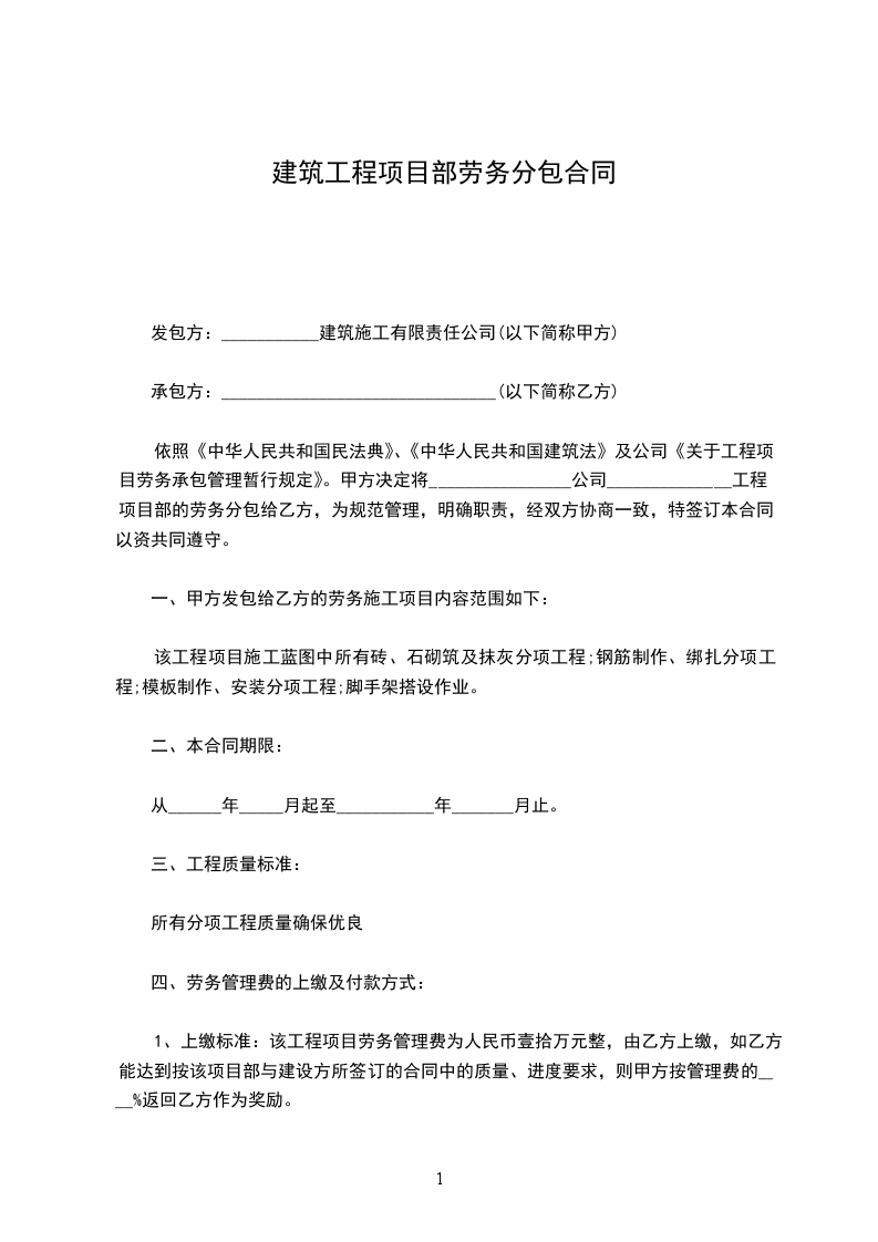 依照《中华人民共和国民法典》、《中华人民共和国建筑法》及公司《关于工程项目劳务承包管理暂行规定》。甲方决定将________________公司______________工程项目部的劳务分包给乙方,为规范管理,明确职责,经双方协商一致,特签订本合同,以资共同遵守。