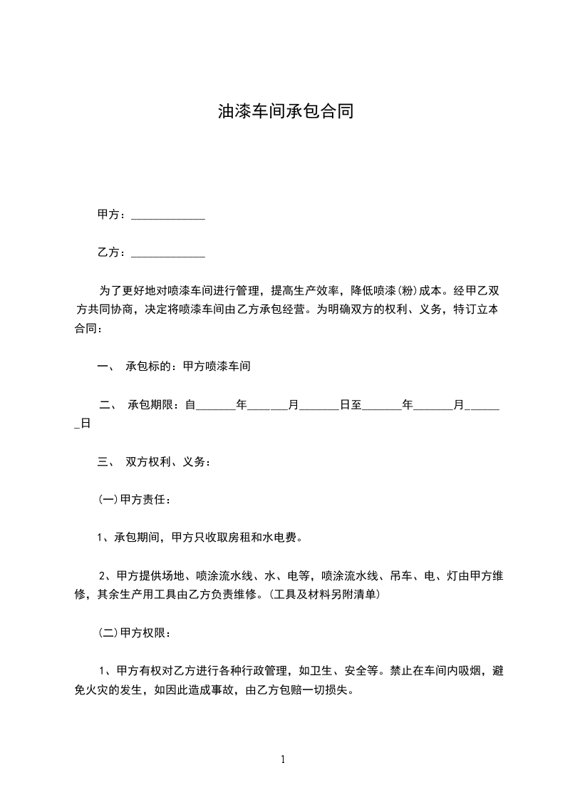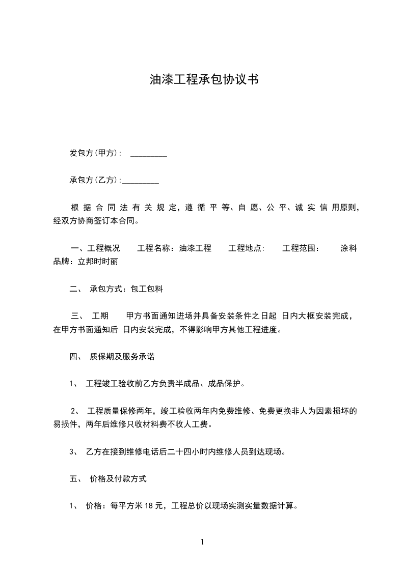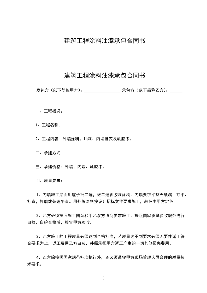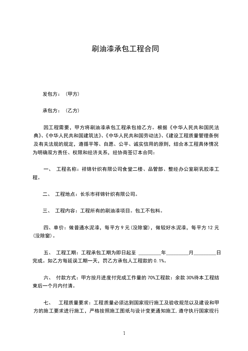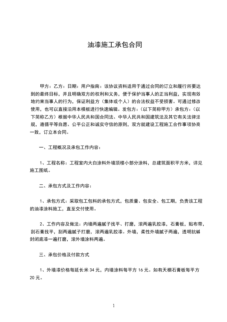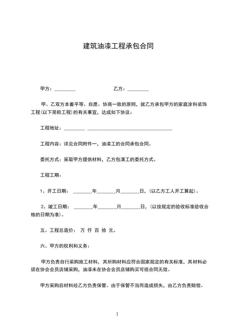 工程内容:详见合同附件一,油漆工的合同承包合同。