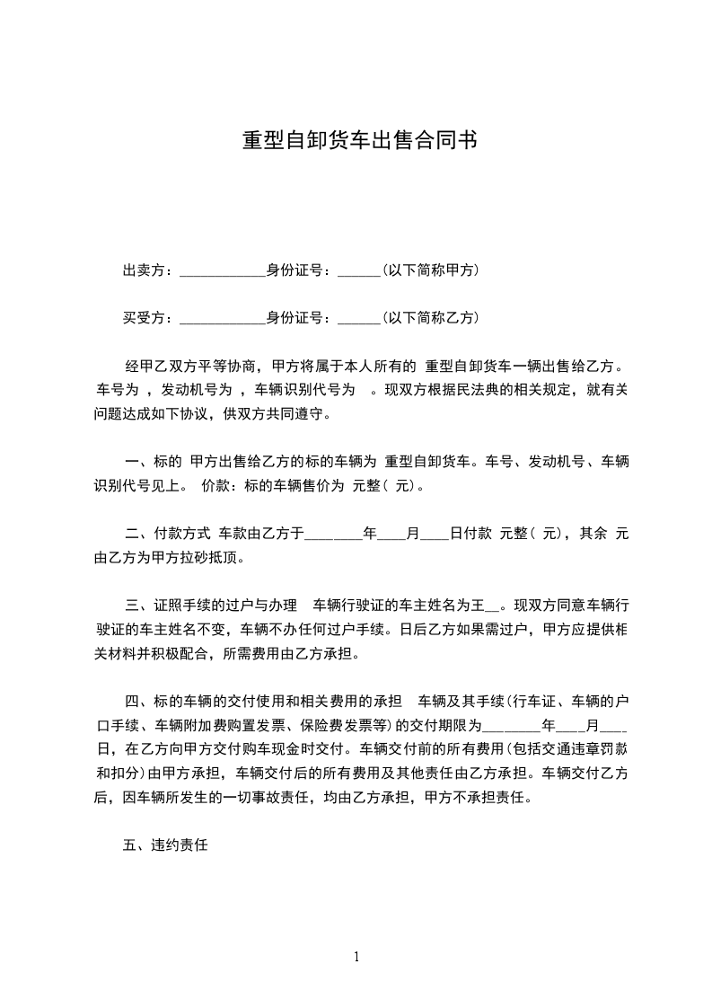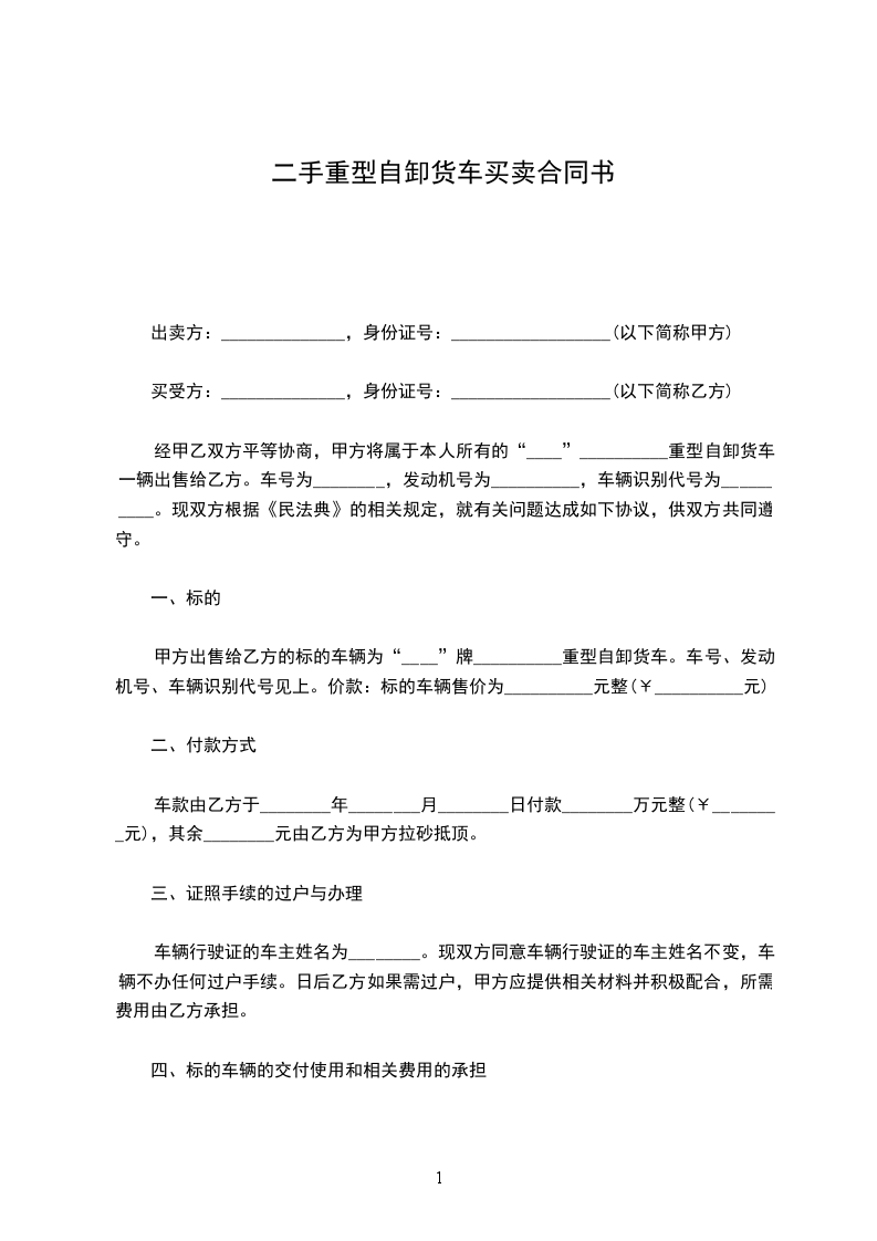 经甲乙双方平等协商,甲方将属于本人所有的“____”__________重型自卸货车一辆出售给乙方。车号为________,发动机号为__________,车辆识别代号为__________。现双方根据《民法典》的相关规定,就有关问题达成如下协议,供双方共同遵守。