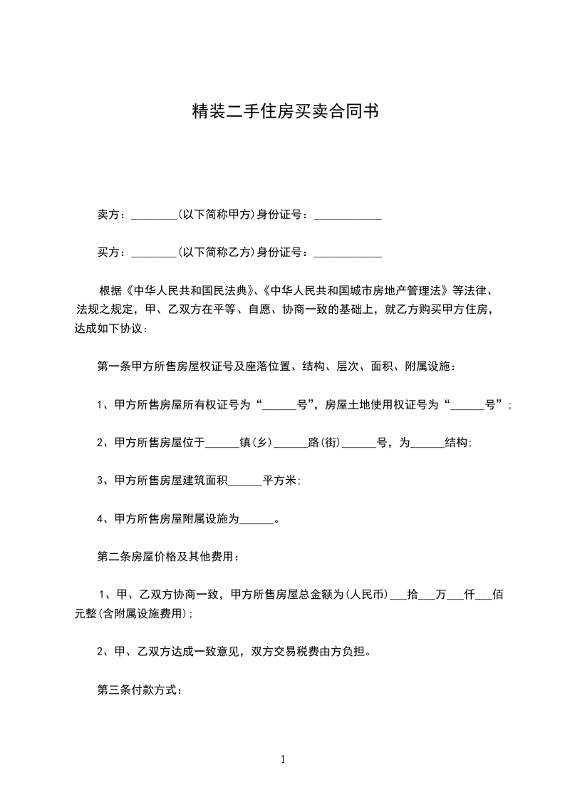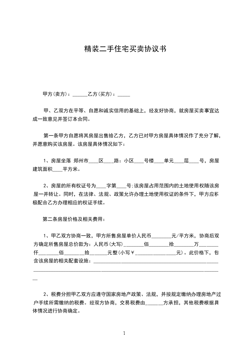 2、甲乙双方协定房屋总价为人民币_______整(¥_______元),乙方预付定金人民币_______整(¥_______元),双方不得以任何理由违约,甲方违约双倍返还定金给乙方,乙方违约则甲方定金不退还定金。