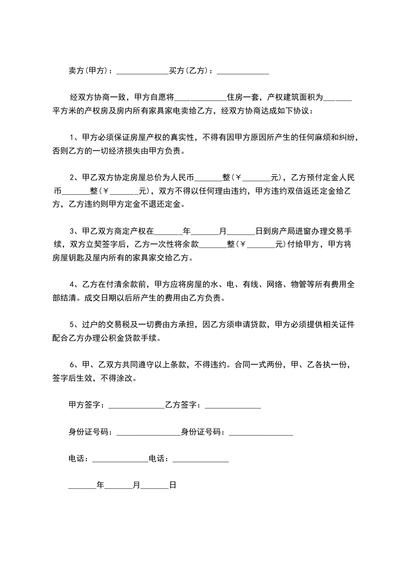 经双方协商一致,甲方自愿将_____________住房一套,产权建筑面积为_______平方米的产权房及房内所有家具家电卖给乙方,经双方协商达成如下协议: