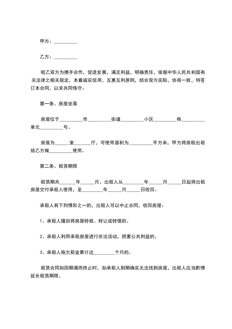 5、租赁期间,任何一方提出终止合同,需提前一个月通知对方,经双方协商后签订终止合同书。乙方在租赁期限期间不得私自转租转借。若一方强行中止合同,须向另一方支付一个月房租作为违约金。
