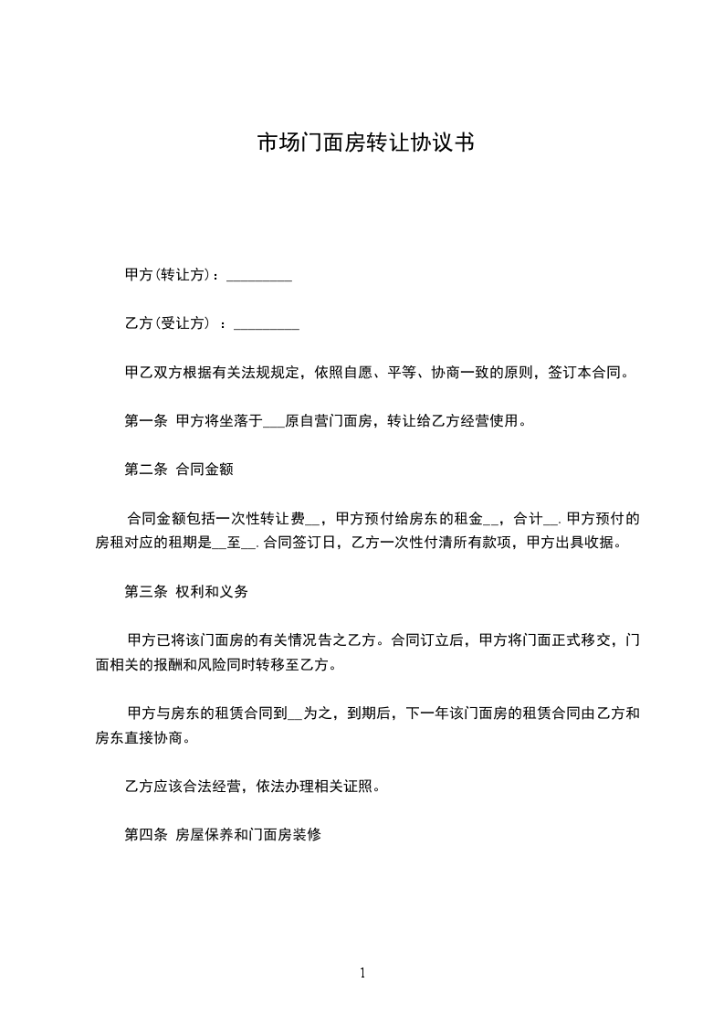 第一条 甲方将坐落于___原自营门面房,转让给乙方经营使用。