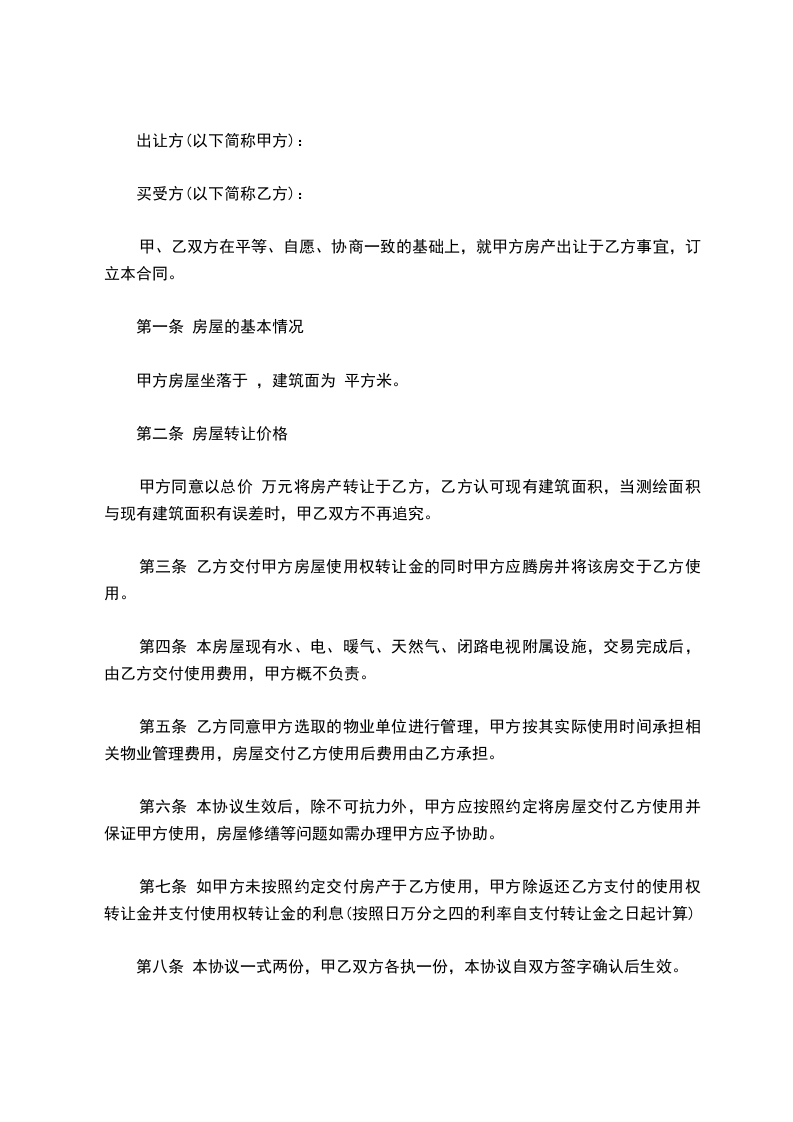 一、 甲方将自己拥有产权的位于________的房屋(建筑面积________平方米),出租给乙方使用。