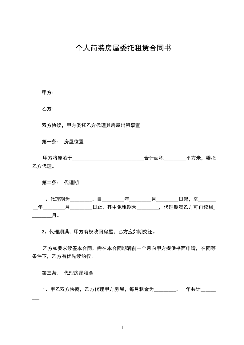 1.甲乙双方协商,乙方代理甲方房屋,每月租金为(人民币)____________,一年共计(人民币)____________。