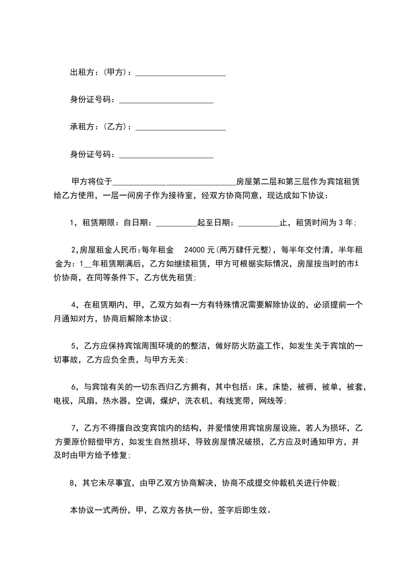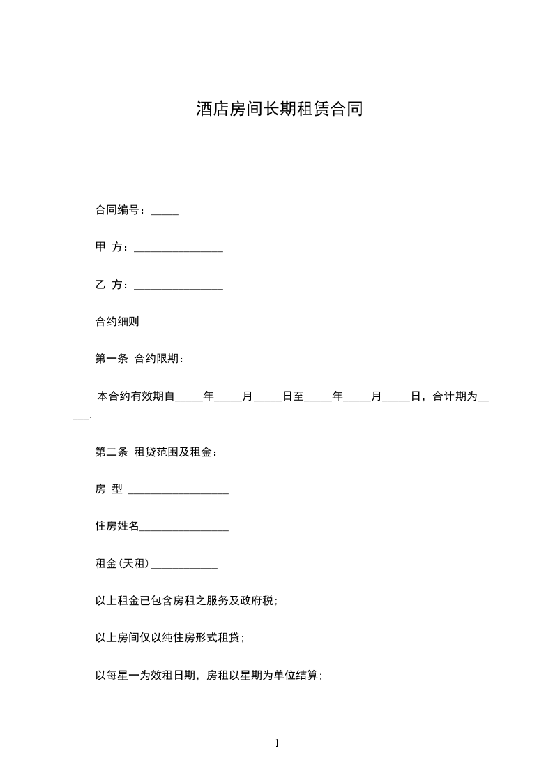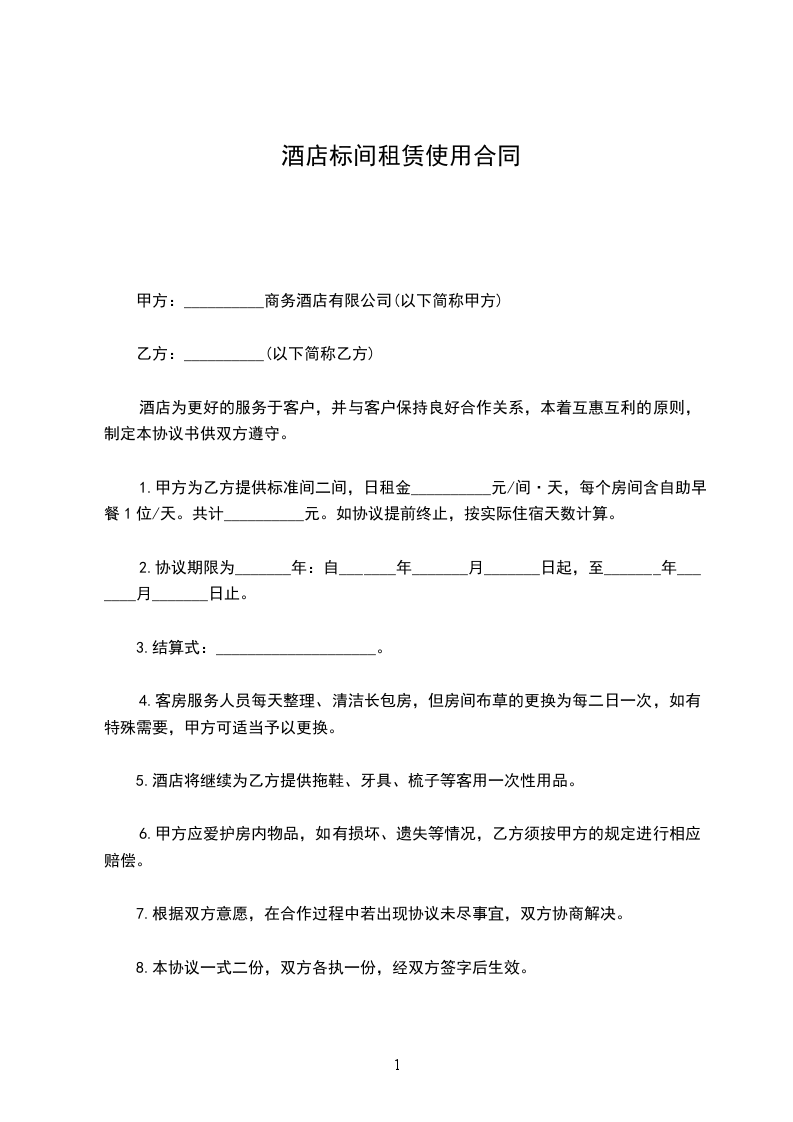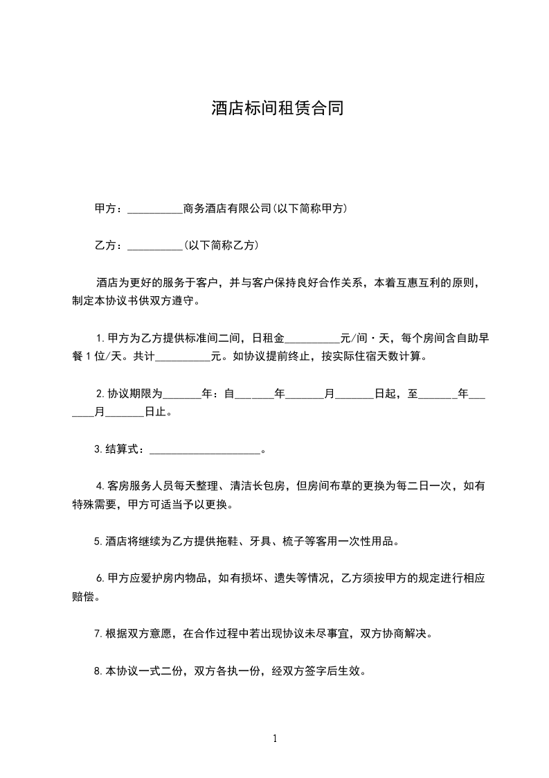 1.甲方为乙方提供标准间二间,日租金__________元/间·天,每个房间含自助早餐1位/天。共计__________元。如协议提前终止,按实际住宿天数计算。