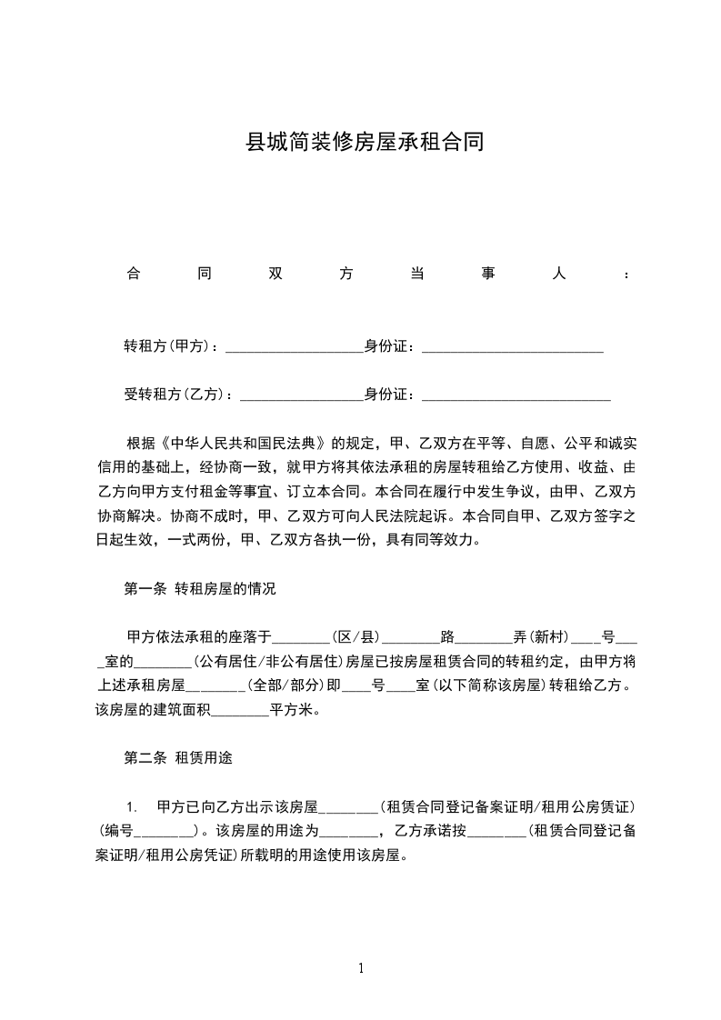 转租方(甲方):___________________身份证:_________________________