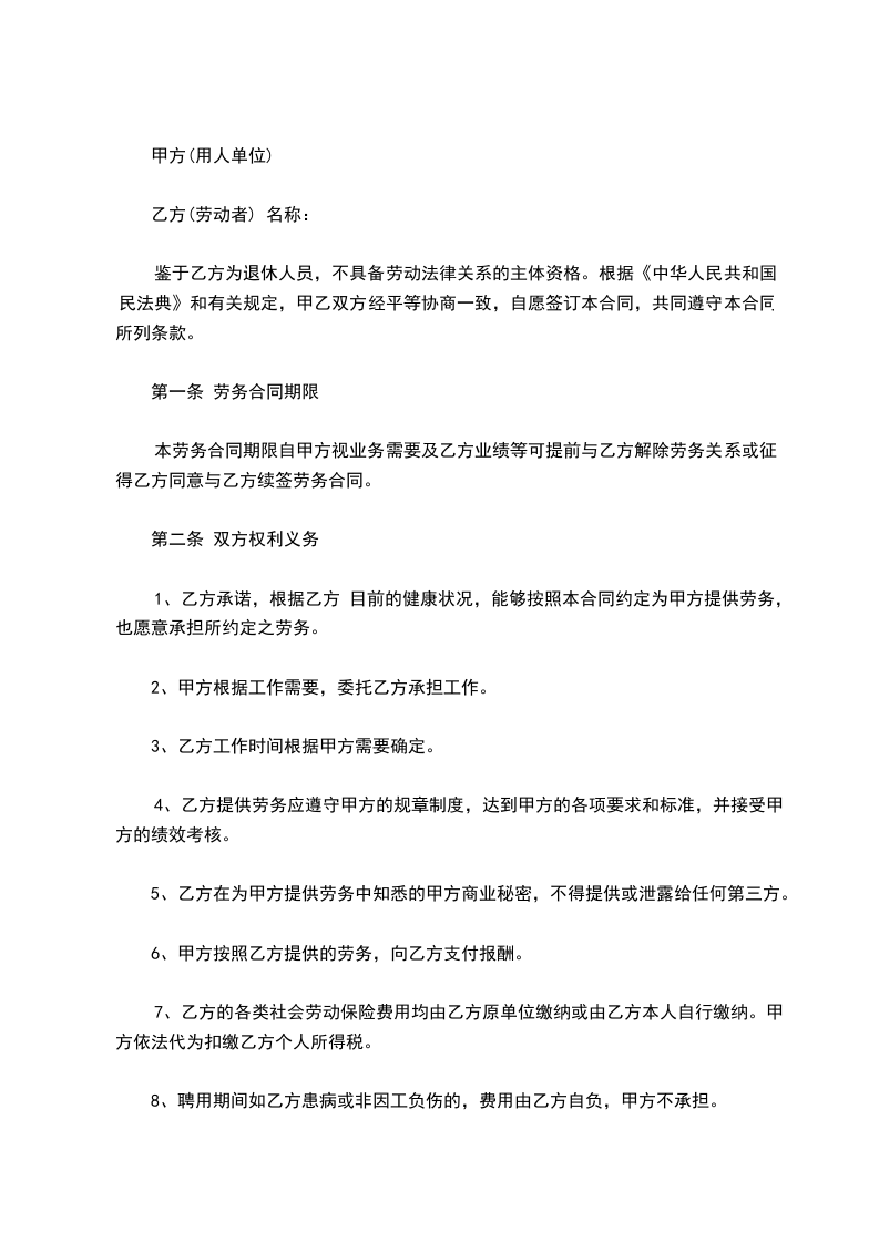 鉴于乙方为退休人员,不具备劳动法律关系的主体资格。根据《中华人民共和国民法典》和有关规定,甲乙双方经平等协商一致,自愿签订本合同,共同遵守本合同所列条款。