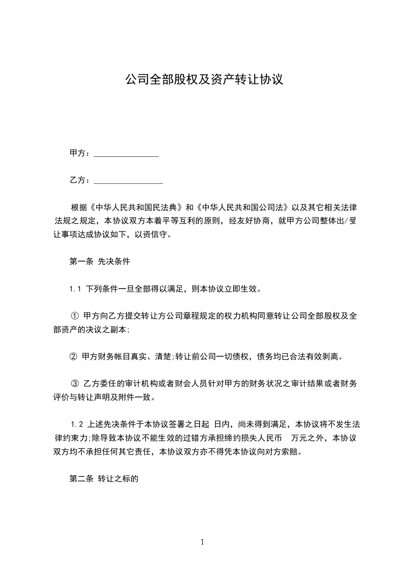 本协议双方一致同意, 公司股权及全部资产的转让价格合计为人民币 元整(rmb)。