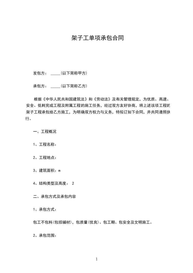 根据《中华人民共和国建筑法》和《劳动法》及有关管理规定,为优质、高速、安全、低耗完成工程及附属工程的施工任务,经过双方友好协商,将上述该项工程的架子工程承包给乙方施工,为明确双方权力与义务,特拟订如下合同,并共同遵照执行。