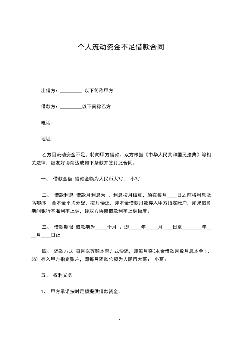 乙方因流动资金不足,特向甲方借款。双方根据《中华人民共和国民法典》等相关法律,经友好协商达成如下条款并签订此合同。