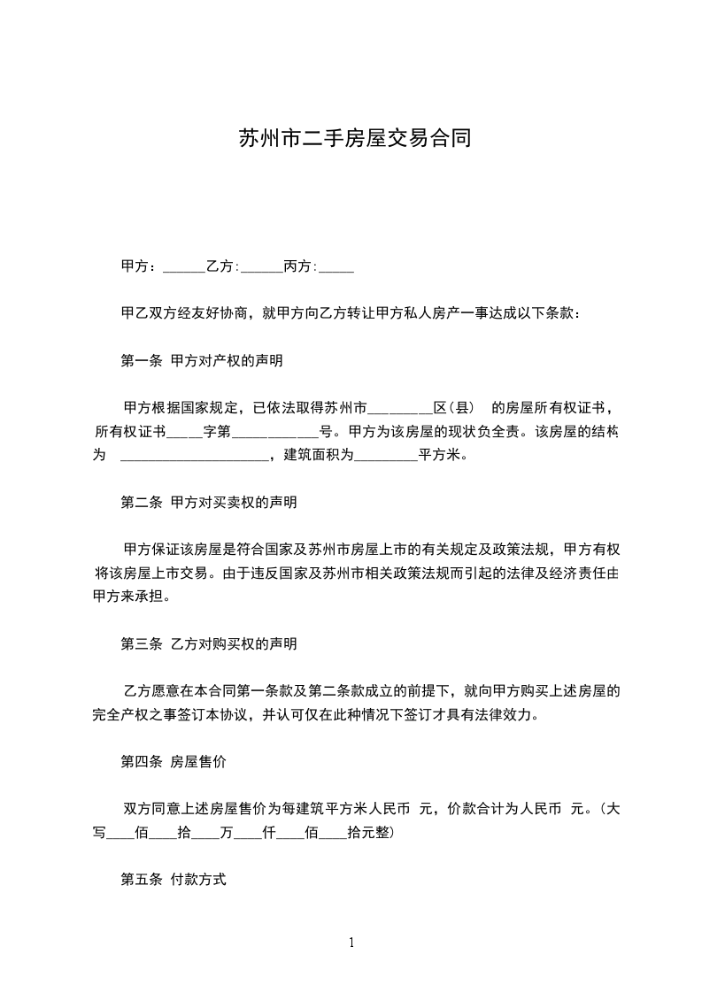 1、 乙方应在签订《苏州市房屋买卖合同》时,支付相当于总房款的10%的定金。