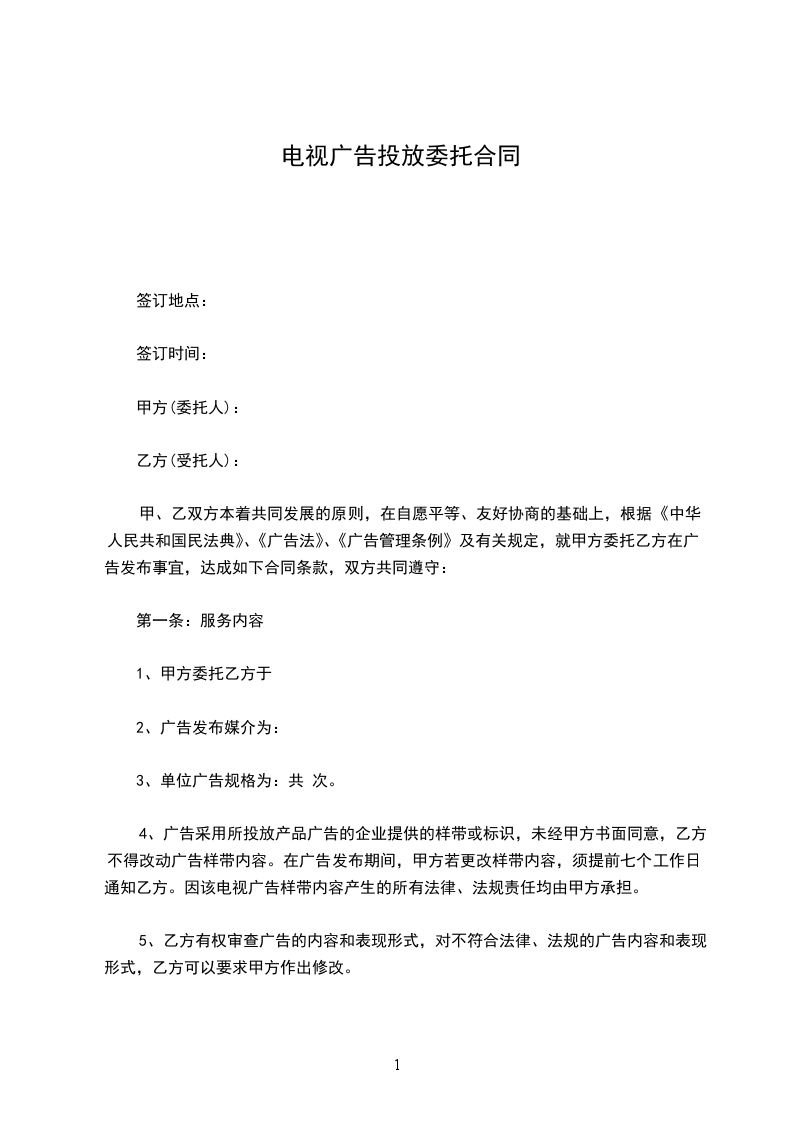 4、广告采用所投放产品广告的企业提供的样带或标识,未经甲方书面同意,乙方不得改动广告样带内容。在广告发布期间,甲方若更改样带内容,须提前七个工作日通知乙方。因该电视广告样带内容产生的所有法律、法规责任均由甲方承担。