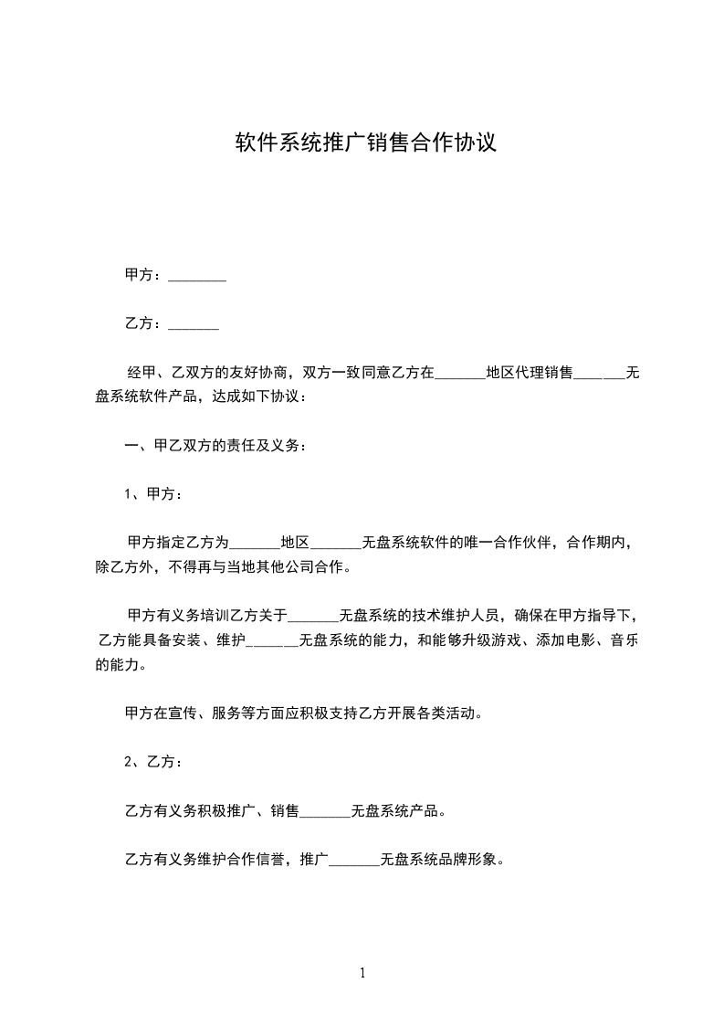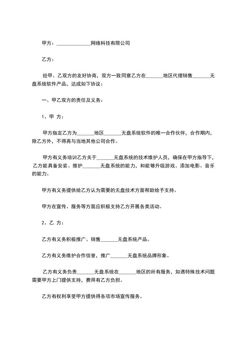 第一条甲乙双方在平等、自愿、公开和诚实信用的基础上,为共同推广_______软件系统,达到良好的合作效果,实现开发商与代理商的双赢目标,就乙方为甲方销售《_______软件》使用许可协议有关事宜协商一致,现签定代理经销合同,以保证双方的利益。