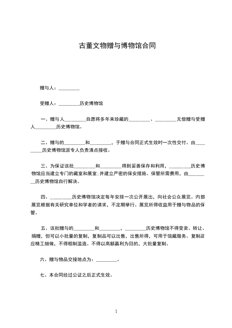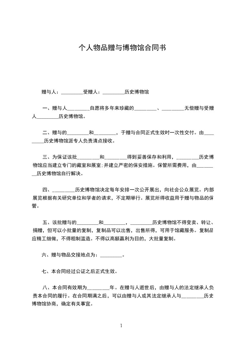 八、本合同有效期为_________年。在赠与人逝世后,由赠与人的法定继承人负责本合同的履行。在合同期满之后,可以由赠与人或其法定继承人与_________历史博物馆协商,确定有关事宜。