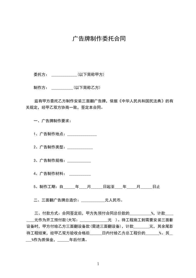 兹有甲方委托乙方制作安装三面翻广告牌,依据《中华人民共和国民法典》的有关规定,经甲乙双方协商一致,签定本合同。