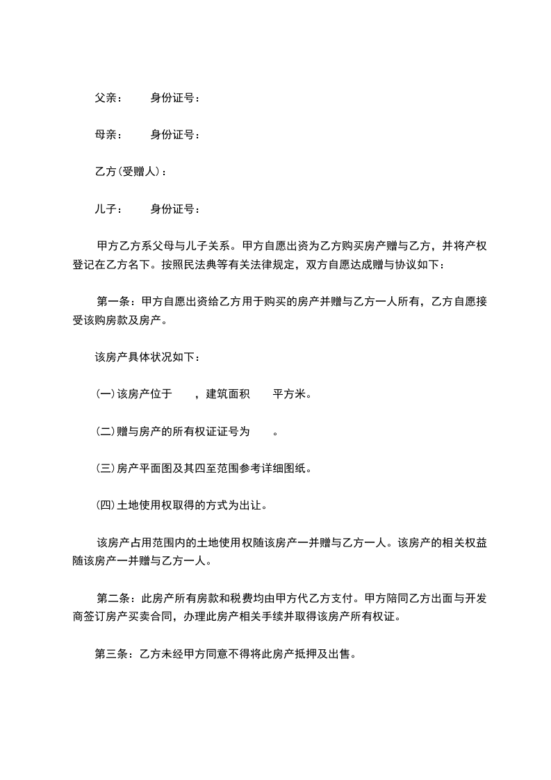 甲方乙方系父母与儿子关系。甲方自愿出资为乙方购买房产赠与乙方,并将产权登记在乙方名下。按照民法典等有关法律规定,双方自愿达成赠与协议如下:
