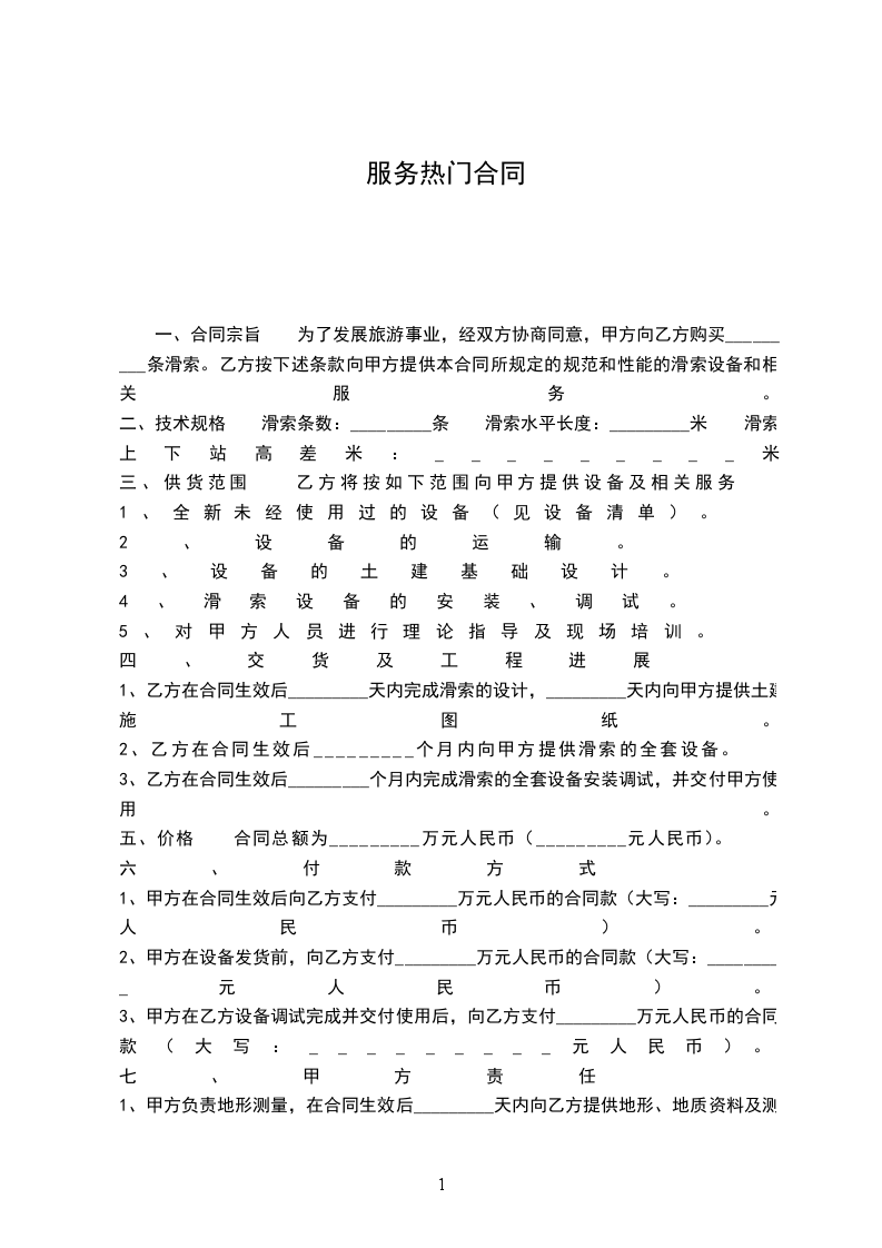 一、合同宗旨 为了发展旅游事业,经双方协商同意,甲方向乙方购买_________条滑索。乙方按下述条款向甲方提供本合同所规定的规范和性能的滑索设备和相关服务。