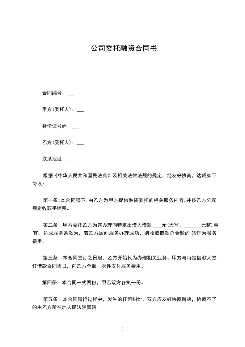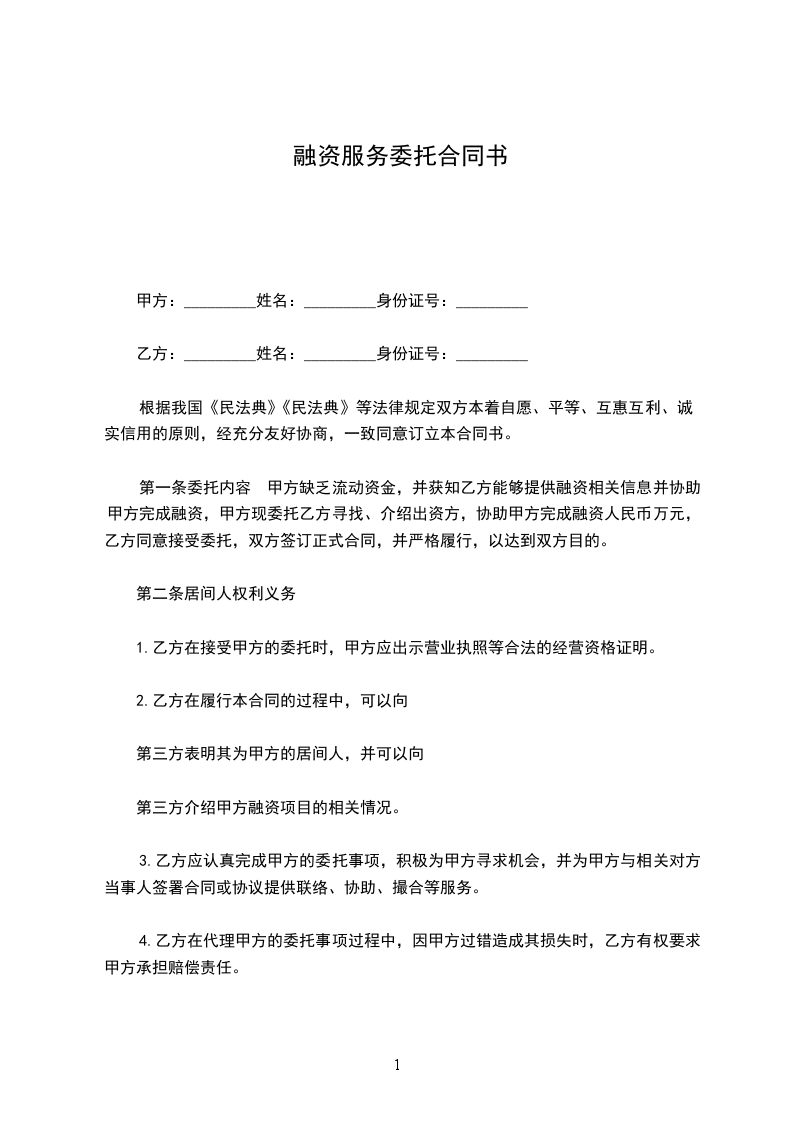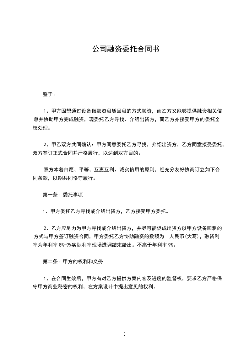 1、 甲方因项目缺乏资金,并获知乙方能够提供融资相关信息并协助甲方完成融资,现委托乙方寻找、介绍出资方,而乙方亦获知甲方的上述意愿。