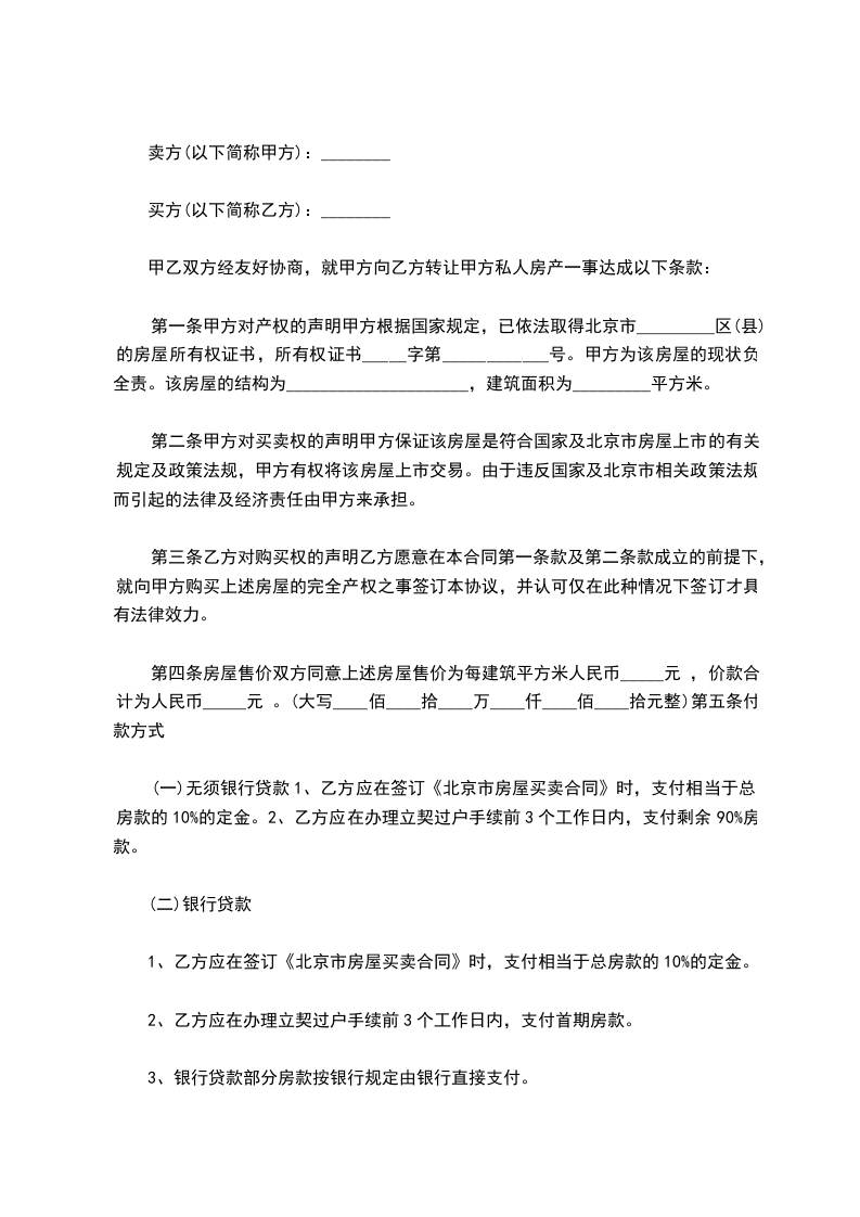 (一)无须银行贷款1、乙方应在签订《北京市房屋买卖合同》时,支付相当于总房款的10%的定金。2、乙方应在办理立契过户手续前3个工作日内,支付剩余90%房款。